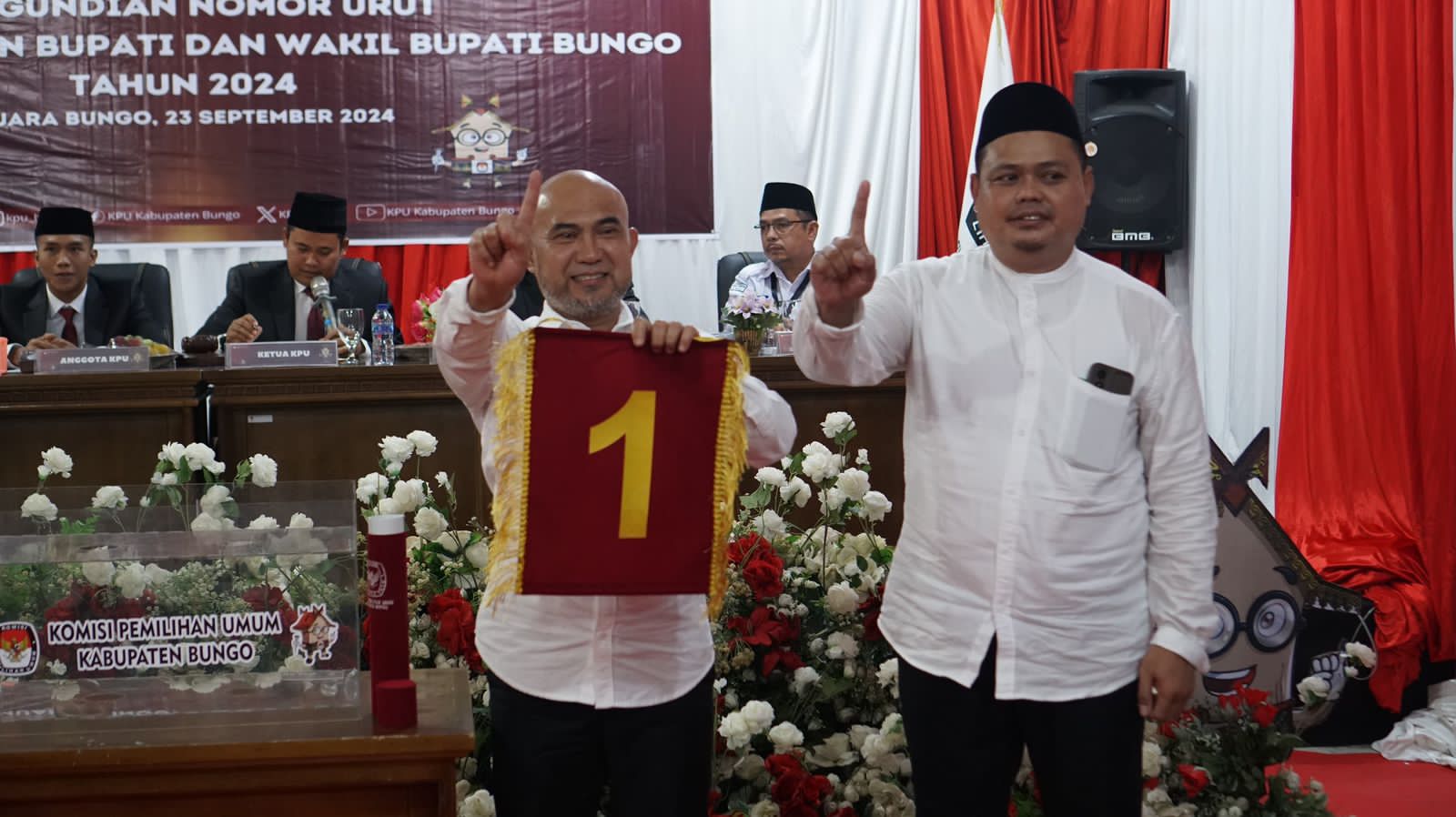 Pasangan Dedy-Dayat mengambil langsung undian yang di siapkan oleh KPU dan pasangan yang mengusung Visi Bungo Baru ini mendapatkan nomor urut satu (1).