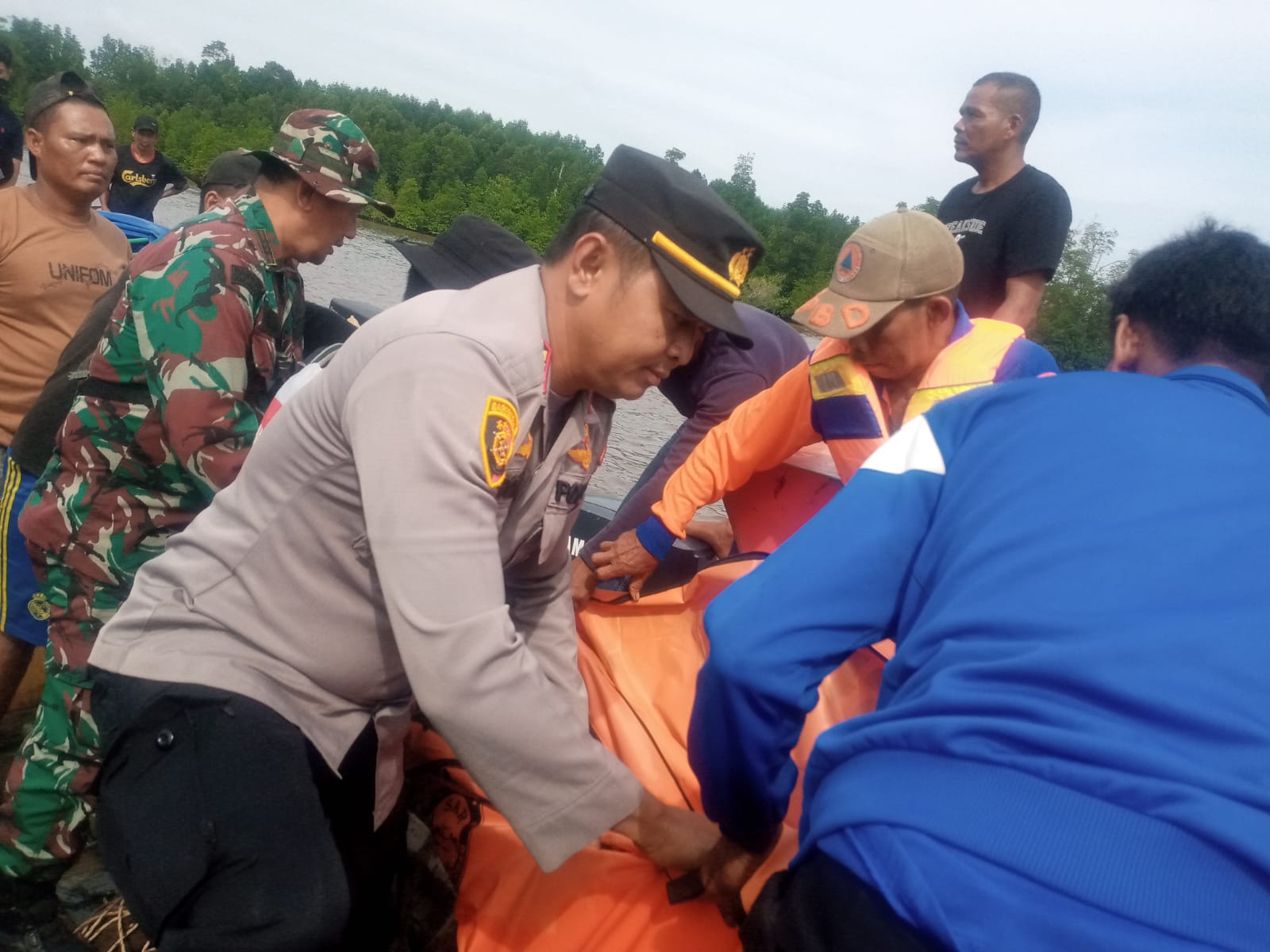 Tim pencarian gabungan dari Polsek Mandah berserta Danramil 08 Mandah KAPTEN INF.R.HANDOKO beserta 1 orang Personil, 3 Personil Satpol Airud Basarnas dan BPBD Kab. Indragiri Hilir.